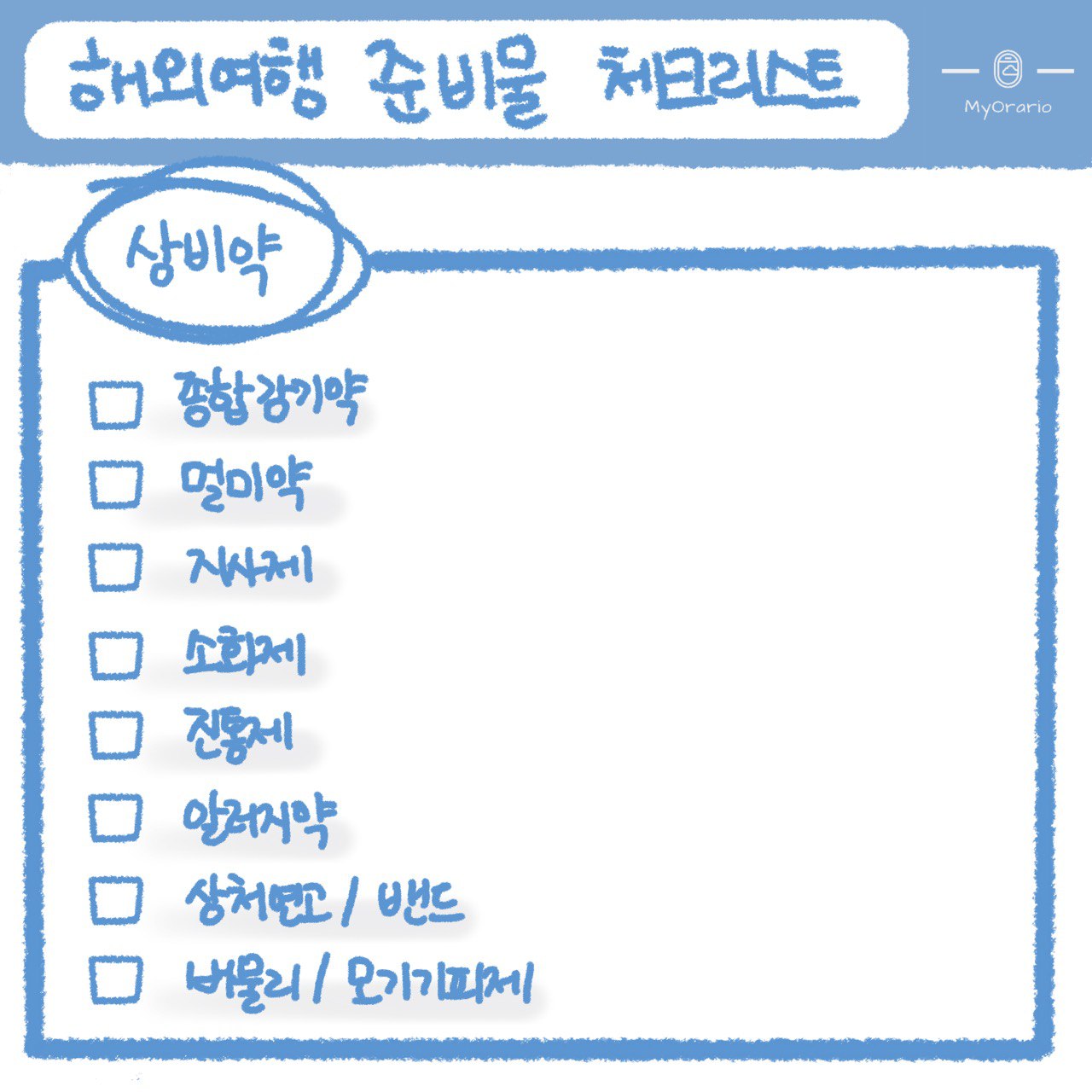 평소에 드시고 계시던 영양제나 약이 있으시다면 체크리스트에 추가해서 꼼꼼히 챙겨주세요.